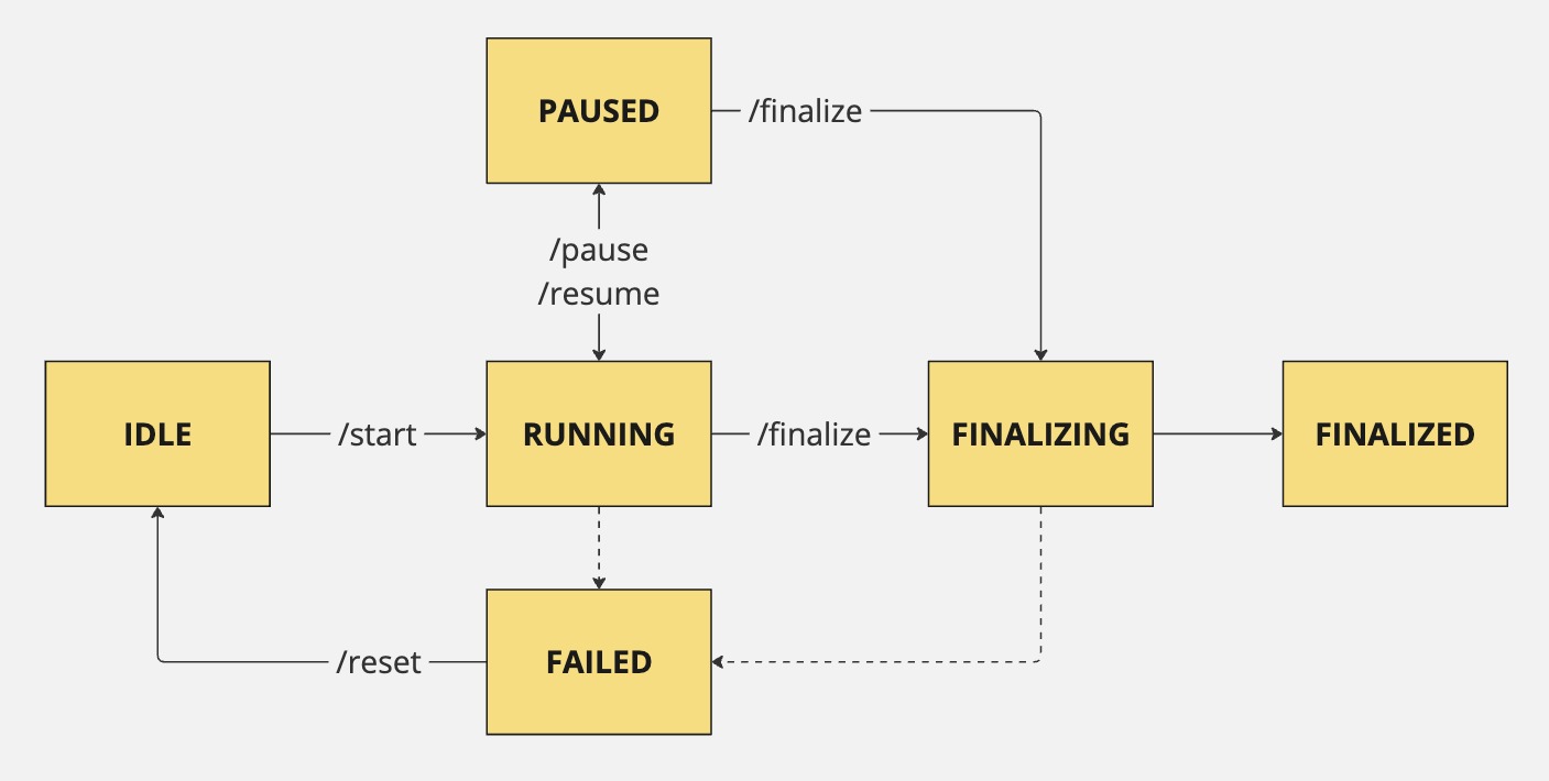 You operate with Percona Link for MongoDB using the set of commands or API calls. Depending on the request it receives, Percona Link for MongoDB has several states as shown in the following diagram: